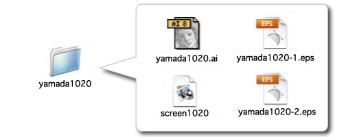 フォルダに名前をつけ、その中に作成された.aiファイルや配置画像、スクリーンショットなどをまとめて入れて下さい。