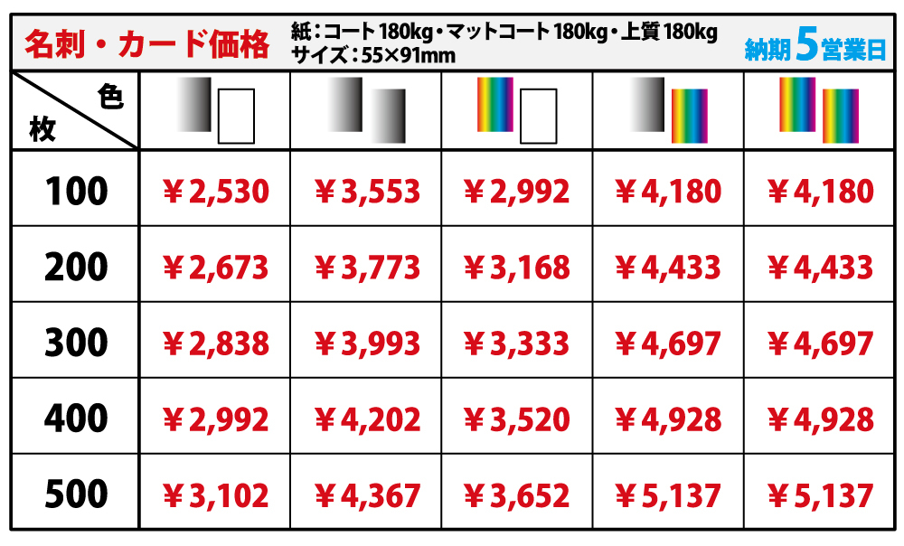 PRICE プリント価格 ※価格は全て税込です シルクプリント 転写プリント カッティングプリント 刺繍 キャップ マグカップ 缶バッジ ユニフォームストラップ タオル ステッカー カッティングシート のぼり 名刺・カード はがき チラシ 名刺・カード デザイン費は別途かかります。 用紙変更は追加料金が必要になる場合があります。 名刺・カード価格算出方法