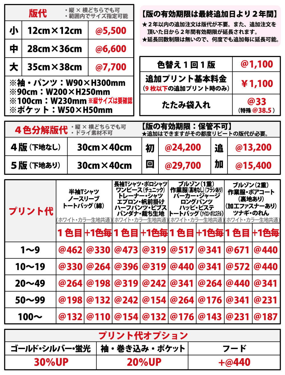 - 上記単価はそれぞれノーマルインクでプリントした際の単価です。ゴールド・シルバー・蛍光インクでのプリントは別途オプションをご確認下さい。